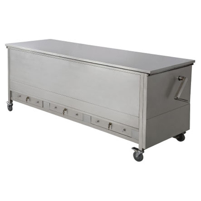 该解剖台螺柱升降,齿轮式传动,传动牢靠,下方带有三个抽屉可用于解剖器械的放置。带万向静音刹车。两层箱体,有储藏及解剖功能。单开台面,有抽风及不抽风两种。