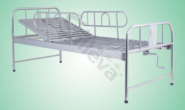 Stainless steel bed with one crank Specification: 2020*900*500mmMaterial: stainless steelDescription: Function of backrestLever system 1setGuardrailsUrine hooksI.V drip holes