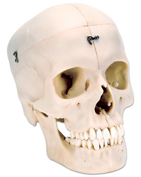 此款模型代表了一个完整正中垂直分部头颅。它可以分拆为头盖骨的两半和颅底,鼻中隔和完整下颌。为了显示咀嚼肌运动,下颌可灵活移动。这是研究人颅骨结构和复杂解剖的极好颅模型。