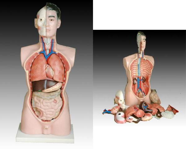 这是一款标准尺寸的男性躯干模型,手工喷漆,精心安装,效果逼真。分成19件:躯干,头(2件),脑,肺(4件),心,气管,食管和主动脉,横膈膜,胃,十二指肠带胰腺和脾,肠,肾,肝和膀胱(2件)。用PVC制成,安放于座上。尺寸:85CM。