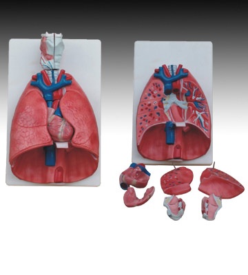 本模型自然大小,分成7件。两瓣肺叶可取下示其内部结构。心脏纵剖示心房、心室和瓣膜。喉头也分成两件。置于底座上。尺寸:36x23x12CM.
