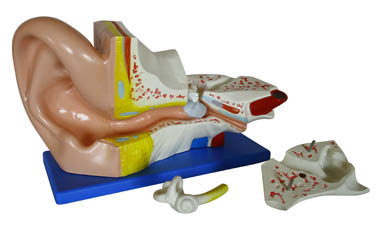大型耳模型,适合初级科学课程使用,显示耳的内部构造及外耳、中耳、内耳和平衡器官的位置关系。1. 外耳:示耳廓形状和外耳道固有特征。2. 中耳:外侧壁为鼓膜,示鼓室内连接鼓膜与内侧壁的三块听小骨(锤骨、砧骨、镫骨),前壁有连通咽部的咽鼓管。3. 内耳:示构成骨迷路中间位的前庭,前方的耳蜗和三个半规管。5倍放大,安放于底座上。尺寸: 43x25x15CM。分成4件。包装: 55x47x53CM, 6件/箱, 18KG