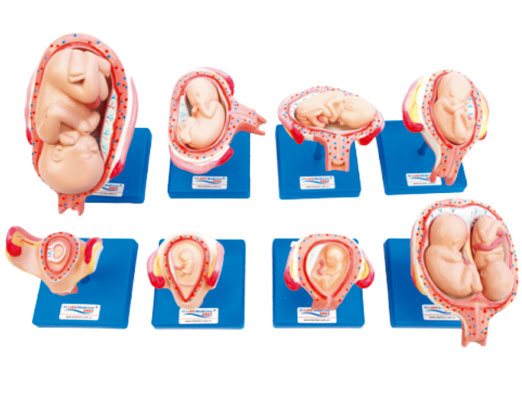 功能特点:该模型由妊娠胚胎发育过程一、二、三、四、五、六、七个月胚胎和五个月双胞胎等8个模型组成,期中四、五、六、七个月胚胎和五个月双胞胎模型胎儿可以取出,并显示子宫、阴道、胎儿、脐带、胎盘、羊膜腔以及卵巢、输卵管等结构。