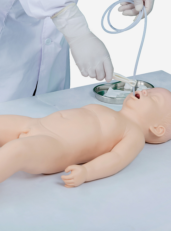 模拟婴儿,外形逼真,触感真实,自口腔、咽喉、食管至胃的器官解剖结构完整,体表骨性标志清楚,关节活动灵活,可摆放不同诊疗体位。适用于进行胃灌洗操作训练及其他护理操作。