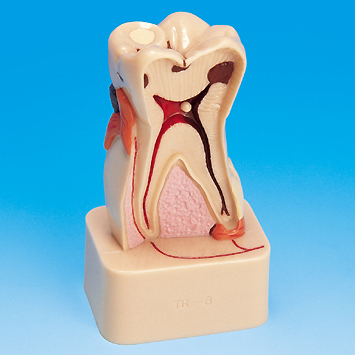 功能特点:该模型显示牙齿病变综合病理形态,包括龋齿破坏缺损、用合金材料充填修补、化脓性牙髓炎、牙髓坏死、牙根脓肿、根尖脓肿、牙周炎、牙槽化脓等病变结构,共有7个部位指示标志。